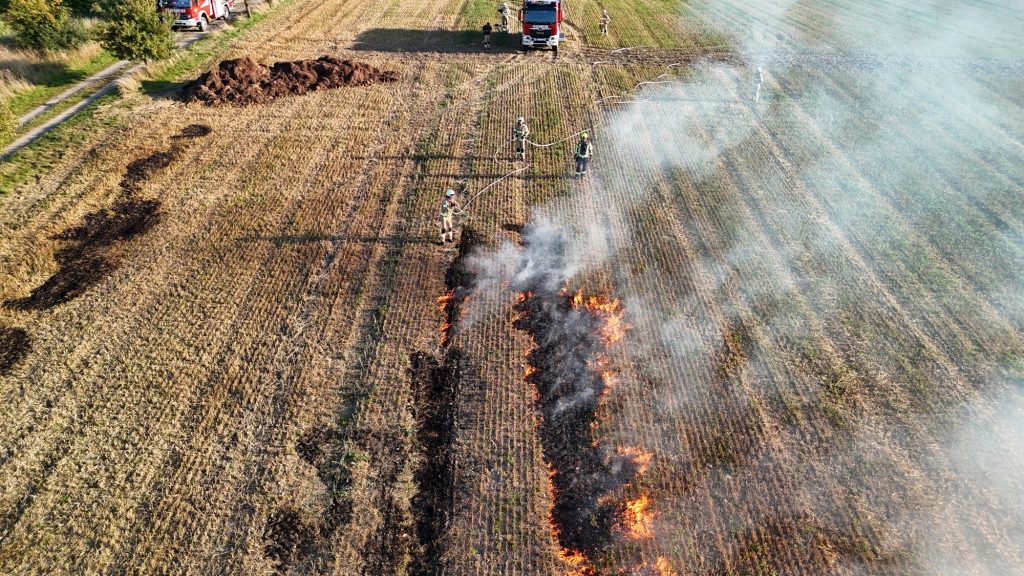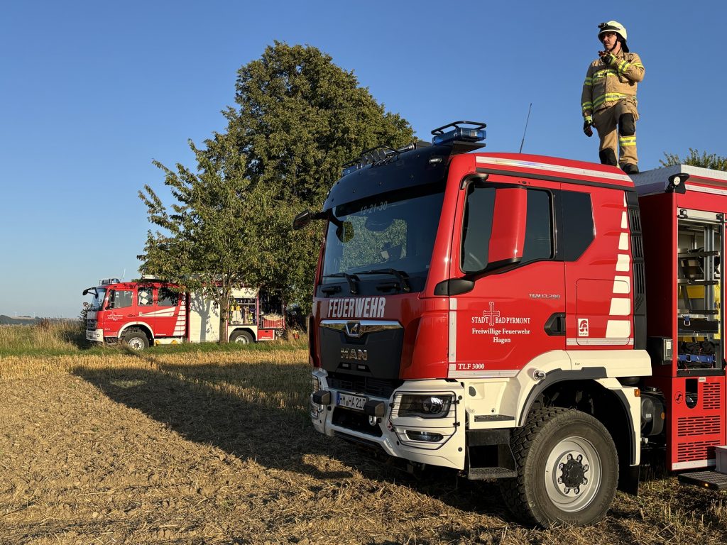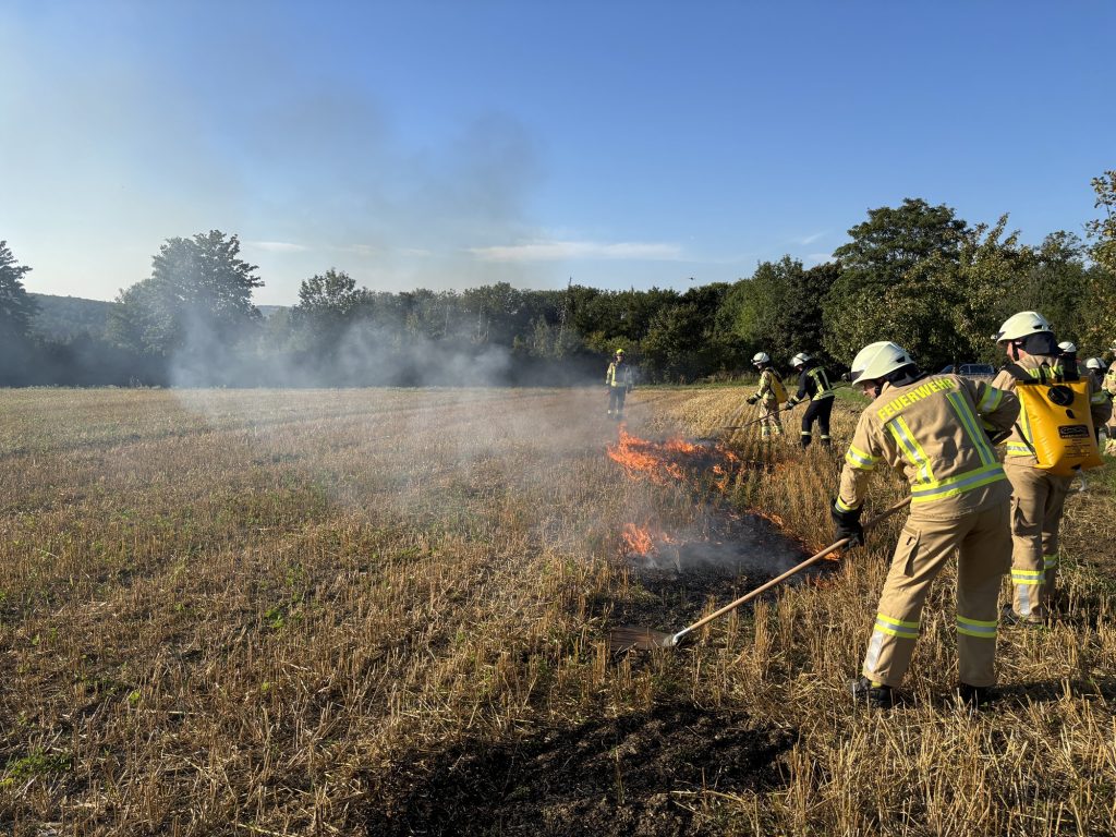 In der letzten Woche fand für unsere Kameradinnen und Kameraden eine praktische Ausbildung zum Thema Vegetationsbrandbekämpfung statt. Dafür wurde ein Stoppelfeld unter kontrollierten Bedingungen in Brand gesetzt und mit der umfangreichen Ausrüstung des TLF3000 gelöscht. Dabei wurden verschiedene Vorgehensweisen trainiert: