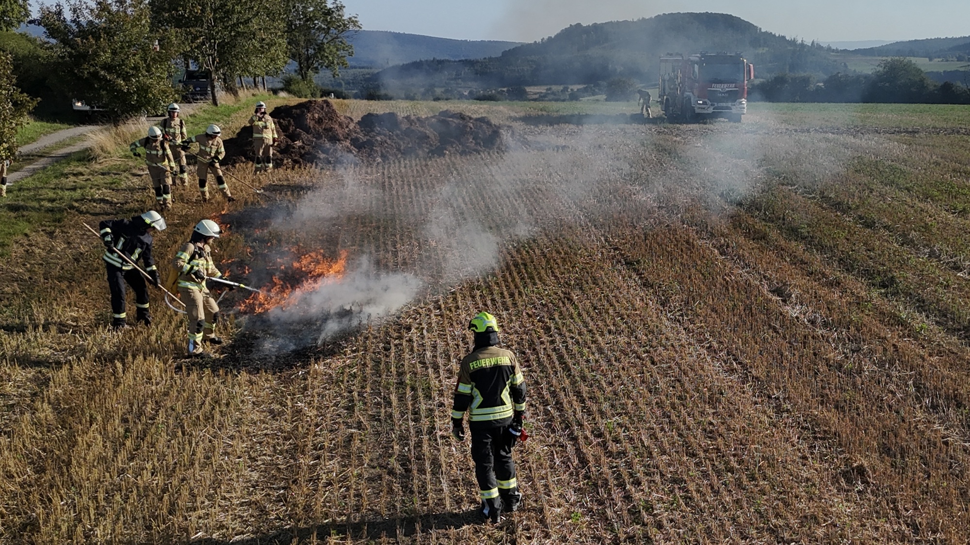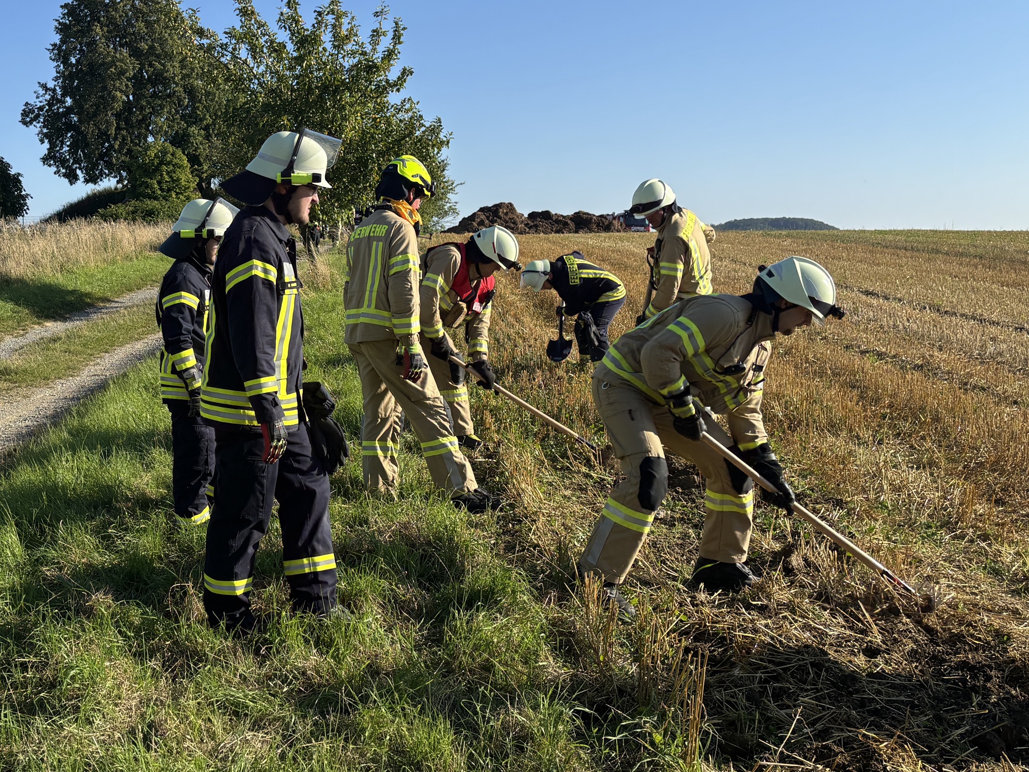 In der letzten Woche fand für unsere Kameradinnen und Kameraden eine praktische Ausbildung zum Thema Vegetationsbrandbekämpfung statt. Dafür wurde ein Stoppelfeld unter kontrollierten Bedingungen in Brand gesetzt und mit der umfangreichen Ausrüstung des TLF3000 gelöscht. Dabei wurden verschiedene Vorgehensweisen trainiert: