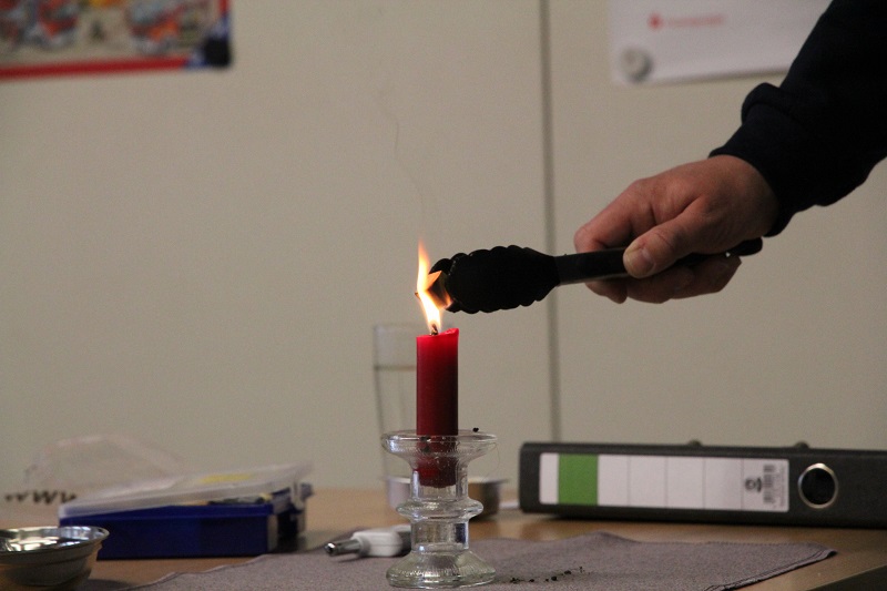 Gespannt hörten die Kinder bei Themen wie Verhalten im Brandfall, Rauchmelder, Notruf, Feueralarm im Kindergarten und Ausrüstung der Feuerwehr zu. Experimente mit Feuer sorgten auch für staunende Blicke. Im Anschluss durfte natürlich ein Foto vor dem HLF nicht fehlen.