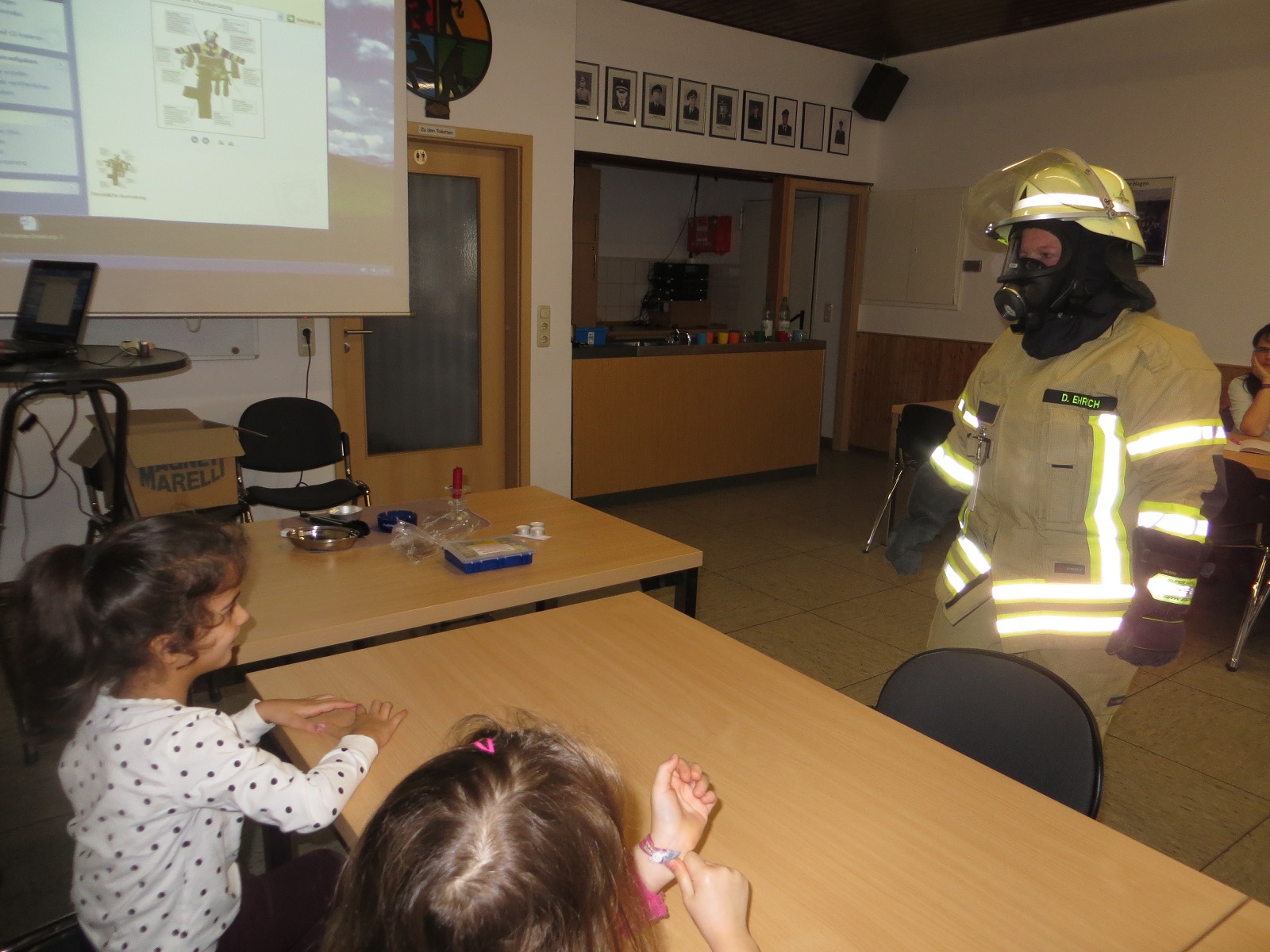 Gespannt hörten die Kinder bei Themen wie Verhalten im Brandfall, Rauchmelder, Notruf absetzen, Feueralarm im Kindergarten und Ausrüstung der Feuerwehr zu. Experimente mit Feuer sorgten auch für staunende Blicke. Am Ende gab es für alle Kinder noch eine Urkunde und eine Überraschungstüte, da sie erfolgreich an der Brandschutzerziehung teilgenommen haben.