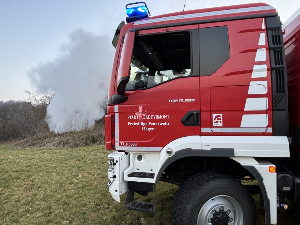 Mit dem Stichwort „F1A: Fläche bis 250qm – brennt Gras und Baumstämme“ wurden am Mittwochnachmittag die Feuerwehr Hagen mit dem TLF3000 und die Feuerwehr Holzhausen an den Hagener Berg alarmiert.