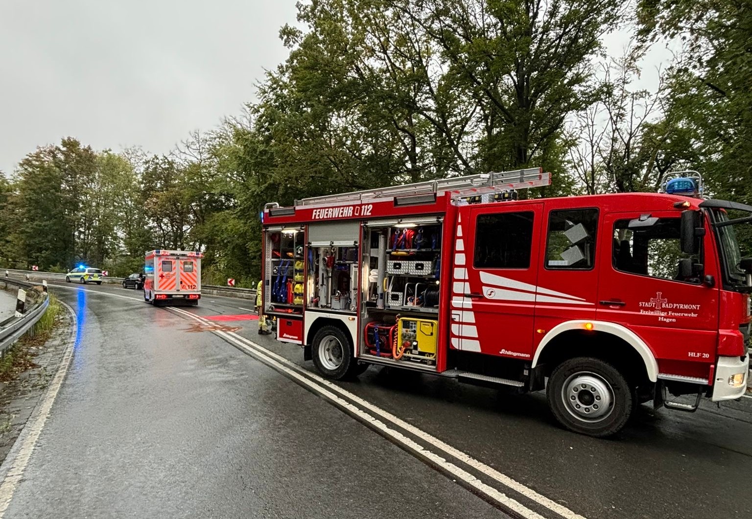 Am Montagnachmittag wurde die Feuerwehr Hagen mit dem Stichwort „H0 auslaufende Betriebsstoffe klein“ zu einem Verkehrsunfall am Hagener Berg alarmiert. Dort kam es in einer Kurve der Strecke zu einer Kollision von zwei PKWs.