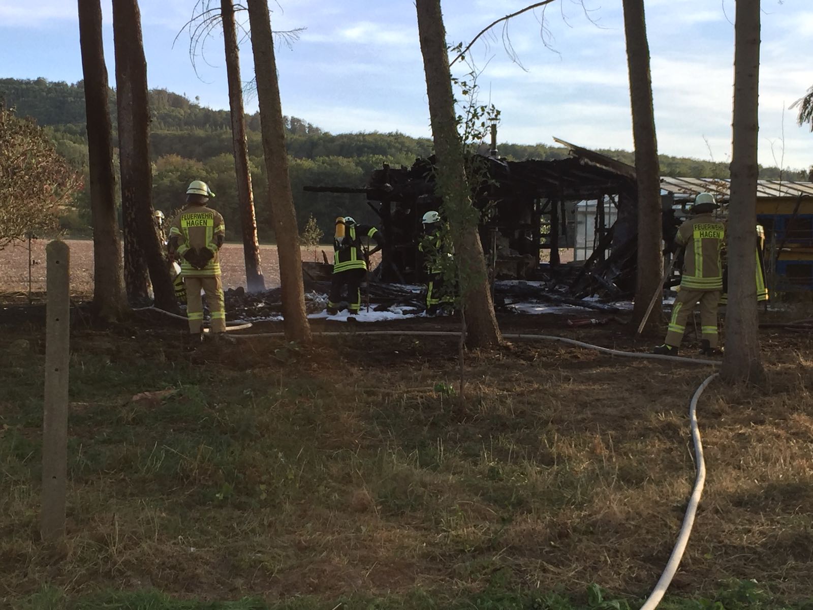 Die Feuerwehr Hagen wurde am Dienstagnachmittag zur Unterstützung der Feuerwehr Barntrup nach Frettholz alarmiert. Im zwischen Hagen und Barntrup gelegenen Ortsteil stand ein Schuppen in Vollbrand. Auch die umliegende Vegetation mit Büschen und Tannen brannte bereits. Das Feuer konnte mit mehreren Rohren und Trupps unter Atemschutz gelöscht und ein Übergreifen auf weitere Gebäude in der Nähe verhindert werden. Um die Löschwasserversorgung sicherzustellen wurde ein Pendelverkehr mit wasserführenden Fahrzeugen u.A. vom Schützenplatz Hagen eingerichtet – eine Versorgung über Hydranten an der Einsatzstelle war nicht möglich. Aus Sicherheitsgründen wurden außerdem 2 durchgebrannte Tannen gefällt. Bei den anschließenden Nachlöscharbeiten wurden mit der Wärmebildkamera auch die letzten Glutnester gefunden und abgelöscht. Die L947 war für mehrere Stunden voll gesperrt.