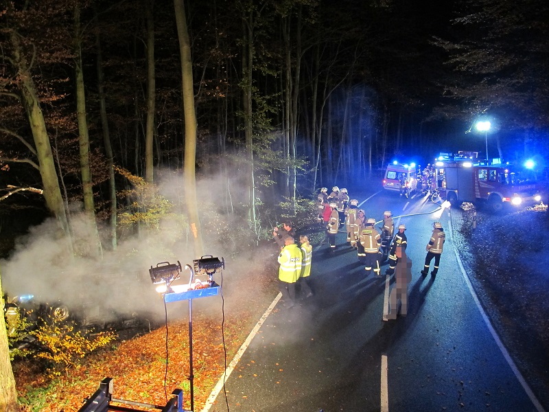 Das HLF20, der KdoW und der Messwagen rückten mit einer Stärke von 1:14 aus. Die Feuerwehr Holzhausen war bereits vor Ort. Zur Unterstützung wurden die Feuerwehr Bad Pyrmont und wir alarmiert. An der Einsatzstelle zeigte sich, dass ein Transporter von der Straße abgekommen und gegen einen Baum in der Böschung geprallt ist – dabei fing das Fahrzeug Feuer. Die beiden Insassen waren glücklicherweise nicht eingeklemmt und konnten sich selber aus dem Transporter befreien und in Sicherheit bringen. Sie wurden vom Rettungsdienst versorgt. Die Feuerwehr Hagen löschte das Fahrzeug mit einem Trupp unter Atemschutz mit dem Schnellangriff ab. Außerdem wurde die Einsatzstelle ausgeleuchtet und gegen den Verkehr abgesichert.