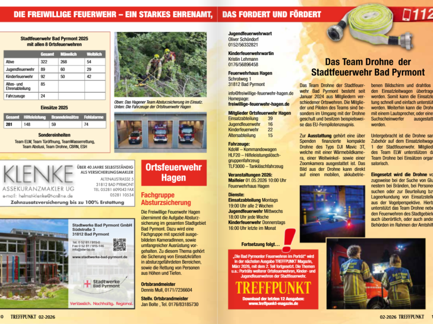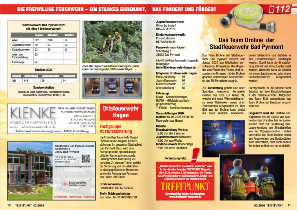 15. Februar 2026 Jan Bolte Treffpunkt Das Treffpunkt-Magazin stellt in seiner aktuellen Ausgabe ausführlich die Stadtfeuerwehr Bad Pyrmont vor. Auch unsere Ortsfeuerwehr ist dabei und wird auf den Seiten 10-11 vorgestellt. Schaut gerne mal rein! TREFFPUNKT Februar 2026 Teilen Auf Facebook teilen (Wird in neuem Fenster geöffnet) Facebook Auf WhatsApp teilen (Wird in neuem Fenster geöffnet) WhatsApp Drucken (Wird in neuem Fenster geöffnet) Drucken